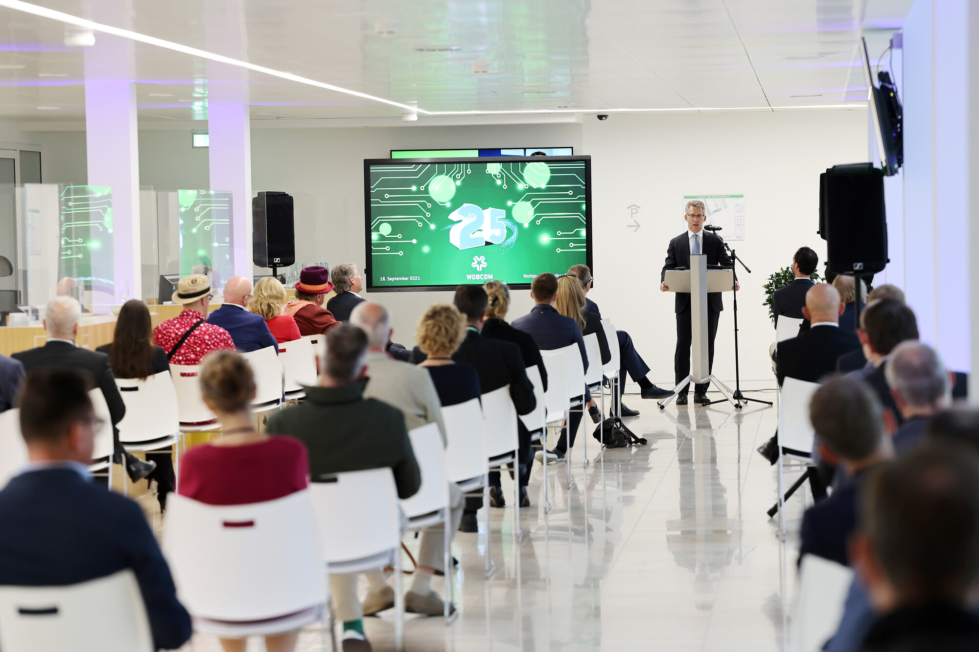 2021 steht das nächste Firmenjubiläum im Kalender – die WOBCOM feiert ihr 25-jähriges Bestehen. Mit Vertretern aus Stadtverwaltung, Politik, Wirtschaft, Wissenschaft und Gesellschaft feierte man im Kundenzentrum und Betriebsrestaurant des Wolfsbuger Nordkopf Tower. Begonnen hat die Erfolgsgeschichte der WOBCOM im Jahr 1997 mit dem Stadtnetz „Wobline“. Heute stellt die WOBCOM als zertifizierter und lizensierter Festnetz-Provider fast 30.000 Kund:innen in Wolfsburg und der Region ihre leistungsfähige Infrastruktur zur Verfügung.